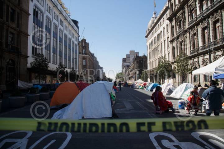 CIUDAD DE MÉXICO, 16FEBRERO2021.- Los plantones por distintos grupos de protestantes habitan en el primer cuadrante del Centro Histórico. Comenzó con el grupo FRENA que ocupaba toda la plancha del Zócalo Capitalino; a mediados de diciembre se disperso y sólo quedó el Campamento México quienes están en contra de Andrés Manuel López Obrador, presidente de México. La calle 20 de noviembre es ocupada por la toma de artesanos Triki Oaxaqueños quienes exigen el permiso para poder ambulantear en el Centro Histórico. Con un mes se encuentra la toma frente Bellas Artes a la altura de Eje Central representantes de desplazados de Tierra Blanca buscan una mesa de diálogo con Alejandro Encinas para darle libertad a los presos políticos y el regreso de sus tierras. Por último con un par de días el Frente popular revolucionario comunista se mantiene frente a Palacio Nacional exigen hablar con el Presidente de la República sobre el desplazó de tierras, desempleo, entre otras peticiones. FOTO: ANDREA MURCIA /CUARTOSCURO.COM