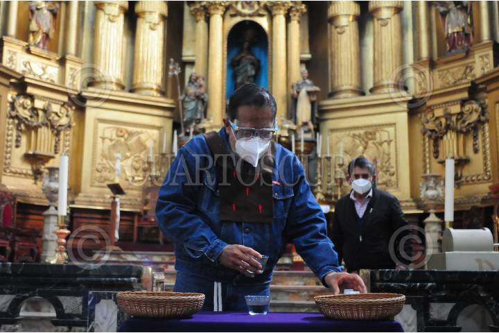 CIUDAD DE MÉXICO, 17FEBRERO2021.- Este miércoles se llevó a cabo la tradición religiosa del Miércoles de Ceniza, acto que da inicio a la Cuaresma rumbo a la Semana Santa, debido a la pandemia de Covid-19, la actividad cotidiana de asistir a las iglesias y colocarse una cruz de ceniza a manos del sacerdote no podrá llevarse a cabo, esto, con el fin de no entrar en contacto con los creyentes y continuar con la cadena de contagio de esta enfermedad. Ante ello, la Arquidiócesis de México optó por recomendar a los padres de cada recinto religioso, regar el polvo sobre la cabeza de los católicos, o bien, regalarles en un pequeño recipiente la cenizas para llevarlas a casa con la familia. FOTO: DANIEL AUGUSTO /CUARTOSCURO.COM