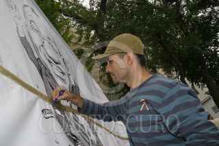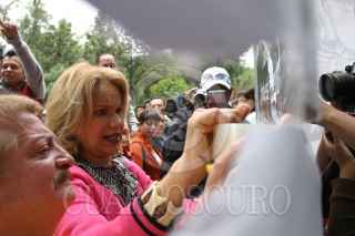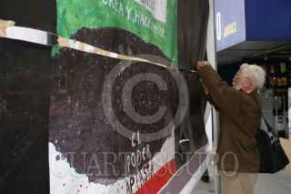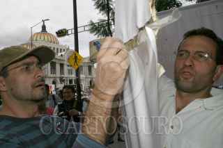 MEXICO, D.F.20JULIO2006.- La escritora Guadalupe Loaeza, acudio a la avenida Juárez a reparar las mantas con expresiones artísticas a favor del conteo voto por voto y casilla por casilla y que el día de ayer fueron rasgadas por un grupo de jóvenes. FOTO: Nelly Salas/CUARTOSCURO.COM