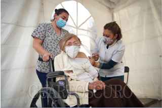CIUDAD DE MÉXICO, 17FEBRERO2021.- La señora Dolores Ramírez, de 103 años de edad, recibió este miércoles la vacuna contra COVID-19 en la Unidad de Medicina Familiar No. 22 del Instituto Mexicano del Seguro Social (IMSS), ubicada en la Alcaldía Magdalena Contreras, en la Ciudad de México. Un ambiente emotividad se vivió en los momentos en que recibió la inmunización. “Gracias, señorita”, dijo la señora Dolores a la enfermera Tayde Isabel Montes Feria, del Seguro Social, quien aplicó la dosis durante el tercer día consecutivo de la jornada de vacunación a adultos mayores. FOTO: IMSS/CUARTOSCURO.COM