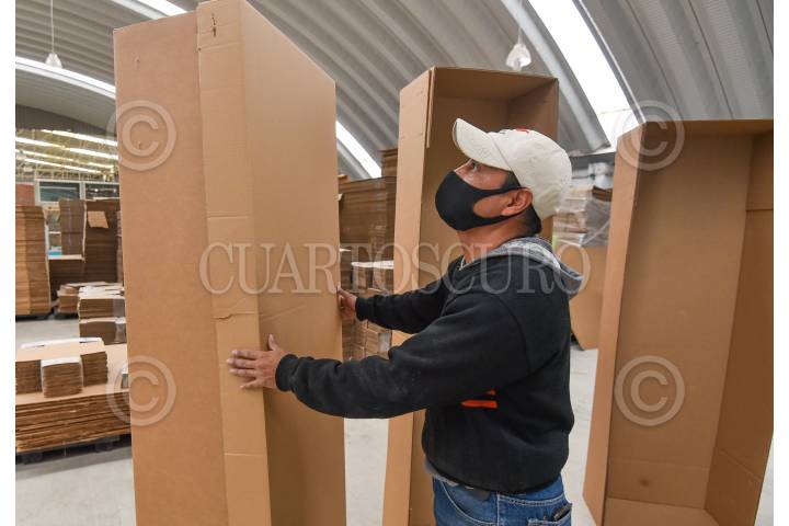 TOLUCA, ESTADO DE MÉXICO, 19FEBRERO2021.- A raíz del inicio de la pandemia por COVID-19 el año pasado la empresa mexicana KJ Cajas de Cartón comenzó a elaboración ataúdes de cartón, han vendido aproximadamente 7 mil a lo largo de la República Mexicana; el cien por ciento ha sido adquirido por la iniciativa privada, trataron de tener un acercamiento con instituciones de salud y diversos niveles de gobierno para que conocieran su producto. Los ataúdes de cartón están fabricados con cartón que puede soportar hasta 130 kilos, son amigables con el ambiente, de fácil armado, ocupan poco espacio ya que se encuentran desarmados, la capacidad de producción es superior a la de un ataúd de madera o cualquier otro material y económico, el precio de una pieza es de 220 pesos mexicanos. Estos ataúdes están diseñados para poder despedir dignamente a la gente que está muriendo por COVID-19, se pueden manipular los cuerpos de forma segura y ordenada. A raíz del incremento de muertes por SARS-CoV-2 el interés por adquirir estos ataúdes ha aumentado en los últimos meses. Como empresa ha realizado donaciones, un ejemplo es la colonia en donde ubican una de sus bodegas, en la cual el número de fallecimientos fue alto y ayudaron a la población con ataúdes de cartón. FOTO: CRISANTA ESPINOSA AGUILAR /CUARTOSCURO.COM