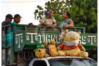 CANCÚN, QUINTANA ROO, 19FEBRERO2021.- Un camión con trabajadores de un tianguis recorre las calles con muñecos de peluche en una zona popular de Cancún. FOTO: ELIZABETH RUÍZ /CUARTOSCURO.COM