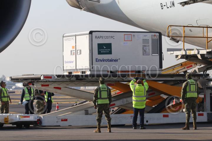 CIUDAD DE MÉXICO, 20FEBRERO2021.- La primera dosis de 200 mil vacunas Sinovac provenientes de Hong Kong para el Covid-19 arribó a la capital en la Terminal 1 del Aeropuerto Internacional de la Ciudad de México (AICM). Martha Delgado, subsecretaría para Asuntos Multilaterales y Derechos Humanos; Zhu Qingqiao, embajador Extraordinario y Plenipotenciario de China ante los Estados Unidos Mexicanos y Luis Antonio Ramírez, director del ISSTE encabezaron el evento. FOTO: GRACIELA LÓPEZ /CUARTOSCURO.COM