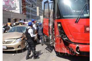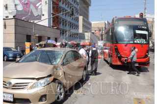 CIUDAD DE MÉXICO, 20FEBRERO2021.- Un automóvil se impactó contra una unidad del metrobús después de dar una vuelta prohibida en avenida Balderas y artículo 123. FOTO: ARMANDO MOROY /CUARTOSCURO.COM