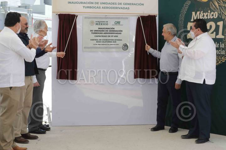 LA PAZ, BAJA CALIFORNIA SUR, 21FEBRERO2021.- Andrés Manuel López Obrador, Presidente de México, encabezó la inauguración de las unidades de turbogás aeroderivadas en la Central de Combustión Interna de la CFE. Lo acompañaron: Carlos Mendoza Davis, gobernador de Baja California Sur; Manuel Bartlett Díaz, Director General de la Comisión Federal de Electricidad; Rubén Gregorio Muñoz Álvarez,Presidente Municipal de La Paz y Juan Martín Patrón Carmona, Coordinador Regional del SUTERM en Baja California Sur. FOTO: PRESIDENCIA /CUARTOSCURO.COM