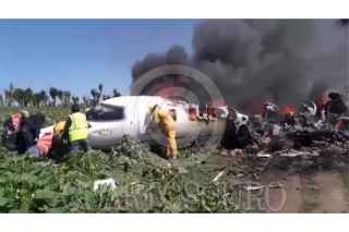EMILIANO ZAPATA, VERACRUZ, 21FEBRERO2021.- Una avioneta de la Fuerza Aérea Mexicana se desplomó en un campo de cultivo en la zona trasera del Aeropuerto Nacional "El Lencero". Hasta el momento la Sedena confirmó el deceso de seis personas sin precisar sus identidades. La unidad es un Learjet modelo 45XR, con matrícula FAM 3912, y la cual tras despegar se vino abajo. Protección Civil del estado reportó que fuerzas de los tres niveles del gobierno trabajan en el área. FOTO:ESPECIAL/CUARTOSCURO.COM