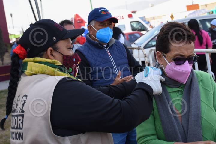 ECATEPEC, ESTADO DE MÉXICO, 22FEBRERO2021.- Cientos de adultos mayores se formaron afuera de las instalaciones del Centro Cultural y Deportivo Las Américas para aplicarse la vacuna contra el Covid-19, que inició este día con su inmunización a este sector de la sociedad. Para este lunes se estima que se apliquen 4 mil inyecciones ante la alta demanda que se presentó en el centro de vacunación. FOTO: DANIEL AUGUSTO /CUARTOSCURO.COM