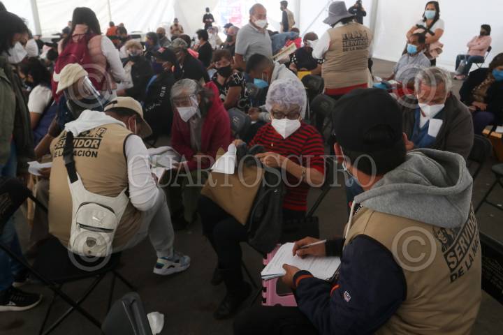 ECATEPEC, ESTADO DE MÉXICO, 23FEBRERO2021.- Cientos de adultos mayores acudieron a la aplicación de las vacuna contra Covid-19 de CoronaVac, desarrollada por el laboratorio chino Sinovac Biotech, en el Multideportivo Las Américas. Desde ayer cientos de personas se quedaron sin la aplicación y desde la madrugada hicieron fila para poder ser vacunados, en el caso de los que ya no alcanzaron número, les postergaron su cita para mañana con un folio. La cita próxima que les agendaron para la segunda dosis es el 23 de marzo en el mismo lugar de aplicación. Alrededor de 2800 vacunas se aplicarán en este módulo del municipio en un horario de 9 a 18 horas. FOTO: GRACIELA LÓPEZ /CUARTOSCURO.COM