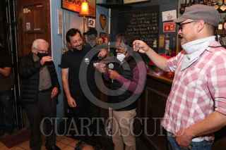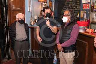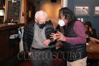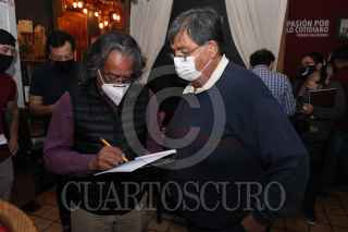 SALTILLO, COAHUILA, 24FEBRERO2021.- Se inauguró la exposición fotográfica "Pasión por lo cotidiano" del fotoperiodista zacatecano Pedro Valtierra, director y fundador de la Agencia y Revista Cuartoscuro, en la Taberna el Cerdo de Babel. La muestra esta conformada con imágenes que reúnen casi cinco décadas de trayectoria y son parte de su archivo personal de más de 350 mil imágenes. Raúl Vera, obispo emérito de Saltillo, asistió como invitado a la ceremonia en donde brindó con Valtierra. FOTO: ALEJANDRO RODRÍGUEZ/CUARTOSCURO.COM