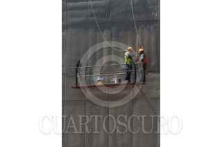 CIUDAD DE MÉXICO, 25FEBRERO2021.- Obreros nivelan el andamio en el que van a trabajar reparando un muro de un edificio en avenida Reforma. FOTO: MOISÉS PABLO/CUARTOSCURO.COM