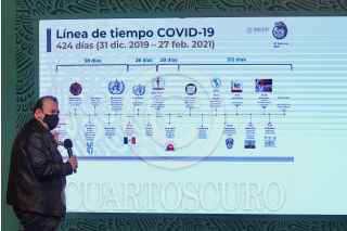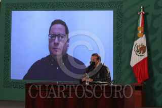 CIUDAD DE MÉXICO, 27FEBRERO2021.- Cristian Zaragoza, director de Información de Epidemiología y José Luis Alomia, director General de Epidemiología, de manera virtual, encabezaron el informe diario sobre la pandemia del Covid-19, en donde se expuso una línea del tiempo a un año del primer caso confirmado de coronavirus en nuestro país. FOTO: ROGELIO MORALES /CUARTOSCURO.COM