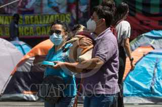 CIUDAD DE MÉXICO, 28FEBRERO2021.- Una pareja carga a su perro para que no se le quemen las patitas en el asfalto de avenida Juárez. FOTO: MOISÉS PABLO/CUARTOSCURO.COM
