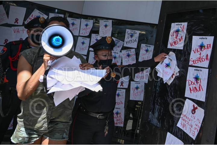 CIUDAD DE MÉXICO, 01MARZO2021.- Integrantes del colectivo Vivhve Libre se manifestaron frente a la Bolsa Mexicana de Valores (BMV) en apoyo de Armando Uri, quien aplicó para una vacante de trabajo en la aerolínea Volaris, empresa que le solicitó unos análisis de sangre sin notificarle que con esos estudios realizarían una prueba de detección de VIH,. El joven argumenta que ese fue el motivo por el cual se le negó el empleo. FOTO: DANIEL AUGUSTO /CUARTOSCURO.COM