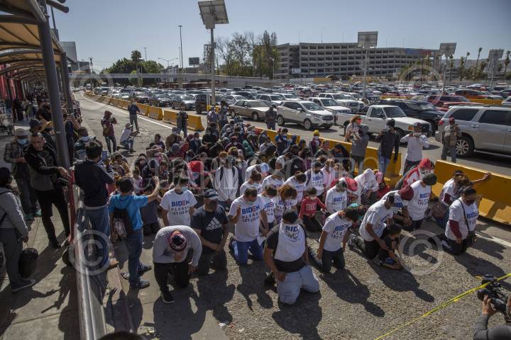 TIJUANA, BAJA CALIFORNIA, 02MARZO2021.- Decenas de migrantes haitianos y centroamericanos que se encuentran instalados en la garita de “El Chaparral” marcharon a la garita Internacional de San Ysidro con el objetivo de que sean escuchados y atendidos por las autoridades de Estados Unidos respecto al asilo político, esto debido a la situación crítica que viven en sus países de origen. Los migrantes han comentado que no se detendrán en sus manifestaciones hasta que se tomen cartas en el asunto por parte de Estados Unidos. Agentes del CBP (Oficina de Aduanas y Protección Fronteriza ) instalaron un fuerte operativo en la entrada del cruce fronterizo para para evitar que los migrantes ingresen al país. FOTO: OMAR MARTÍNEZ /CUARTOSCURO.COM