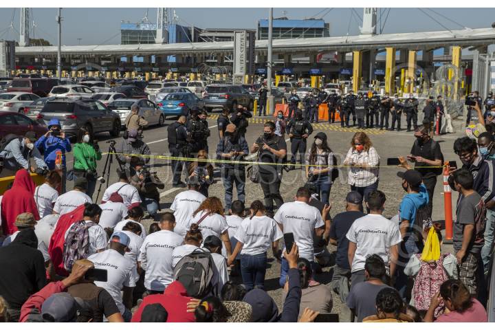 TIJUANA, BAJA CALIFORNIA, 02MARZO2021.- Decenas de migrantes haitianos y centroamericanos que se encuentran instalados en la garita de “El Chaparral” marcharon a la garita Internacional de San Ysidro con el objetivo de que sean escuchados y atendidos por las autoridades de Estados Unidos respecto al asilo político, esto debido a la situación crítica que viven en sus países de origen. Los migrantes han comentado que no se detendrán en sus manifestaciones hasta que se tomen cartas en el asunto por parte de Estados Unidos. Agentes del CBP (Oficina de Aduanas y Protección Fronteriza ) instalaron un fuerte operativo en la entrada del cruce fronterizo para para evitar que los migrantes ingresen al país. FOTO: OMAR MARTÍNEZ /CUARTOSCURO.COM