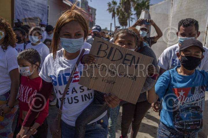 TIJUANA, BAJA CALIFORNIA, 02MARZO2021.- Decenas de migrantes haitianos y centroamericanos que se encuentran instalados en la garita de “El Chaparral” marcharon a la garita Internacional de San Ysidro con el objetivo de que sean escuchados y atendidos por las autoridades de Estados Unidos respecto al asilo político, esto debido a la situación crítica que viven en sus países de origen. Los migrantes han comentado que no se detendrán en sus manifestaciones hasta que se tomen cartas en el asunto por parte de Estados Unidos. Agentes del CBP (Oficina de Aduanas y Protección Fronteriza ) instalaron un fuerte operativo en la entrada del cruce fronterizo para para evitar que los migrantes ingresen al país. FOTO: OMAR MARTÍNEZ /CUARTOSCURO.COM