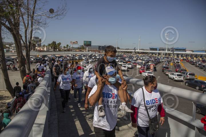 TIJUANA, BAJA CALIFORNIA, 02MARZO2021.- Decenas de migrantes haitianos y centroamericanos que se encuentran instalados en la garita de “El Chaparral” marcharon a la garita Internacional de San Ysidro con el objetivo de que sean escuchados y atendidos por las autoridades de Estados Unidos respecto al asilo político, esto debido a la situación crítica que viven en sus países de origen. Los migrantes han comentado que no se detendrán en sus manifestaciones hasta que se tomen cartas en el asunto por parte de Estados Unidos. Agentes del CBP (Oficina de Aduanas y Protección Fronteriza ) instalaron un fuerte operativo en la entrada del cruce fronterizo para para evitar que los migrantes ingresen al país. FOTO: OMAR MARTÍNEZ /CUARTOSCURO.COM