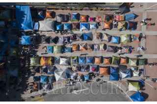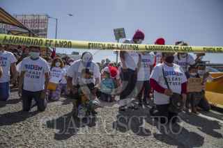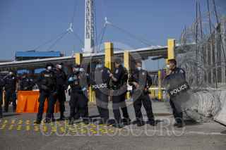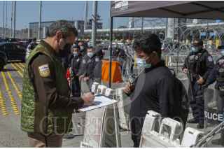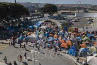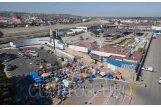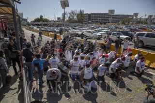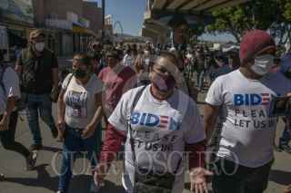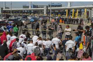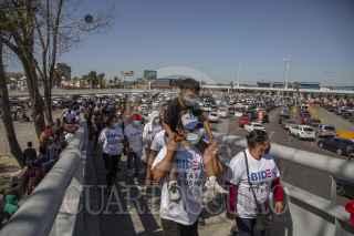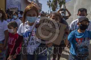 TIJUANA, BAJA CALIFORNIA, 02MARZO2021.- Decenas de migrantes haitianos y centroamericanos que se encuentran instalados en la garita de “El Chaparral” marcharon a la garita Internacional de San Ysidro con el objetivo de que sean escuchados y atendidos por las autoridades de Estados Unidos respecto al asilo político, esto debido a la situación crítica que viven en sus países de origen. Los migrantes han comentado que no se detendrán en sus manifestaciones hasta que se tomen cartas en el asunto por parte de Estados Unidos. Agentes del CBP (Oficina de Aduanas y Protección Fronteriza ) instalaron un fuerte operativo en la entrada del cruce fronterizo para para evitar que los migrantes ingresen al país. FOTO: OMAR MARTÍNEZ /CUARTOSCURO.COM