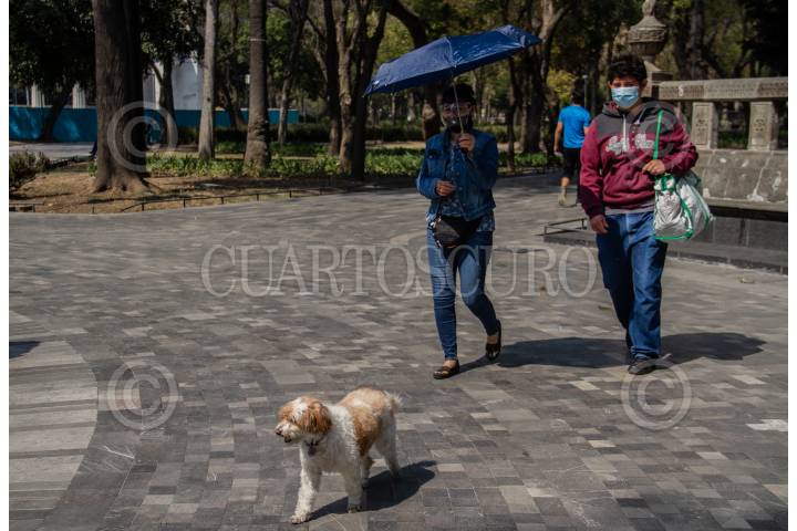 CIUDAD DE MÉXICO, 03MARZO2021.- Capitalinos buscan como resguardarse del sol y las altas temperaturas durante su visita al Centro Histórico perteneciente a la alcaldía Cuauhtémoc una de las 4 donde se activo la alerta naranja según informes de La Secretaría de Gestión Integral de Riesgos y Protección Civil. La Alameda Central avisa el próximo comienzo de la primavera con árboles llenos de Jacarandas. FOTO: ANDREA MURCIA /CUARTOSCURO.COM