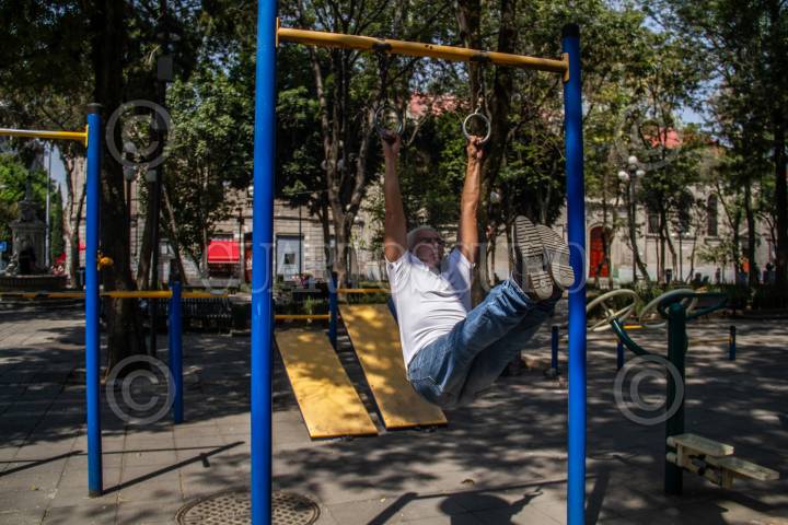 CIUDAD DE MÉXICO, 03MARZO2021.- Desde este martes reabrieron sus puertas 2,186 gimnasios y clubes deportivos en la Ciudad ante la entrada del semáforo naranja epidemiológico. Carlos Gutierrez García de 83 años es entrenador del Gimnasio El nuevo Jordan, al saber que ya podrían abrir se encontró con la negativa por parte de los dueños quienes explicaron que en su lugar de trabajo aún no pasaría esto por la falta de dinero para poder acondicionar el espacio y que cumpla las medidas sanitarias para evitar contagios del virus SARS-Cov-2. Por ello, Carlos decidió entrenar en un parque cercano al lugar con material recaudado por él y sus alumnos. Con el fin de mantener los entrenamientos de boxeo ya que cree que se deben seguir formando grandes atletas para erradicar la violencia que existe en su barrio, además que esto es su única fuente de trabajo. El esperara a que se pueda entrar la Ciudad a semáforo verde y regresar a las instalaciones, mientras continuara entrenando al aire libre. FOTO: ANDREA MURCIA /CUARTOSCURO.COM