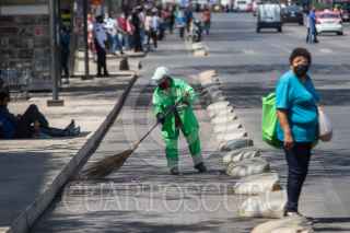 CIUDAD DE MÉXICO, 04MARZO2021.- Una trabajadora de la Secretaría de Obras barre avenida Juárez bajo los intensos rayos de sol. FOTO: MOISÉS PABLO/CUARTOSCURO.COM