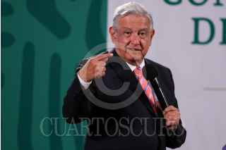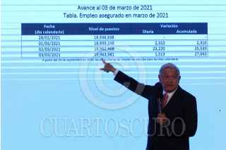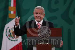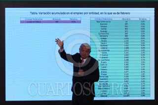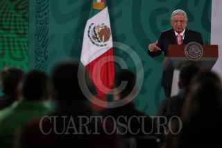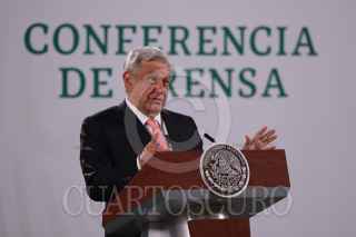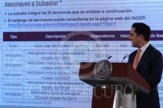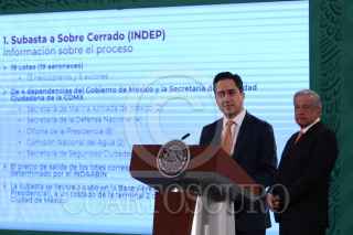 CIUDAD DE MÉXICO, 05MARZO2021.- Andrés Manuel López Obrador, presidente de México, y Jorge Mendoza Sánchez, director de Banobras, encabezaron la conferencia mañanera donde informaron sobre la subasta de 19 aeronaves que se compraron en sexenios pasados. La licitación se llevará acabo en la Base Aérea Militar No. 19 (Ex hangar presidencial) el próximo 12 de marzo. FOTO: GALO CAÑAS/CUARTOSCURO.COM