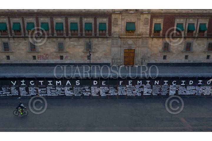 CIUDAD DE MÉXICO, 07MARZO2021.- Mujeres de distintas colectivas intervinieron las vallas colocadas por el gobierno de la Ciudad en Palacio Nacional previo al 8m -Día internacional de la Mujer-. Organizadas pintaron durante la noche los nombres de mujeres sobrevivientes y víctimas de feminicidio como protesta contra las vallas que protegen el recinto. FOTO: ANDREA MURCIA / CUARTOSCURO.COM