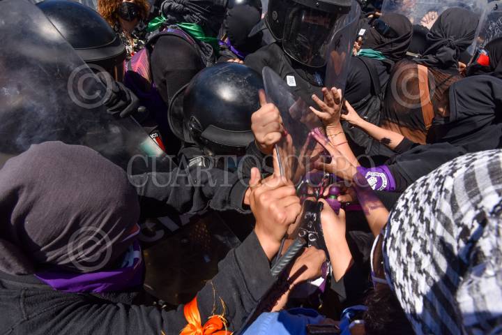 TOLUCA, ESTADO DE MÉXICO, 08MARZO2021.- En el marco del Día Internacional de la Mujer diversos colectivos de mujeres del Valle de Toluca se reunieron en la Facultad de medicina de la UAEM, a minutos de iniciar su marcha tuvieron un enfrentamiento con policías estatales al impedirles el paso por la avenida Jesus Carranza y continuaron su marcha por Paseo Tollocan. FOTO: CRISANTA ESPINOSA AGUILAR /CUARTOSCURO.COM