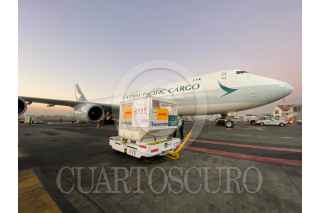 CIUDAD DE MÉXICO, 11MARZO2021.- Marcelo Ebrard Casaubon,secretario de Relaciones Exteriores, informó que la mañana de este jueves arribó a México el principio activo suficiente para envasar 3 millones de dosis de la vacuna de CanSino Biologics. Éstas serán trasladadas a la planta de la farmacéutica Drugmex, ubicada en el estado de Querétaro, para su envasado y proceso de supervisión final por parte de la Comisión de Control Analítico y Ampliación de Cobertura (CCAyAC) de la Comisión Federal para la Protección Contra Riesgos Sanitarios (Cofepris). FOTO: SECRETARIA DE RELACIONES EXTERIORES /CUARTOSCURO.COM