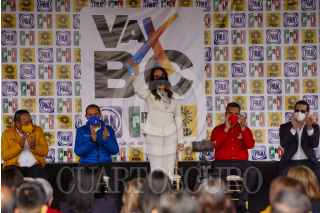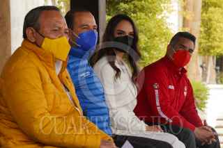 MEXICALI, BAJA CALIFORNIA, 11MARZO2021.- Marko Cortés presidente del Partido Acción Nacional PAN; Jesús Zambrano Grijalva presidente del Partido de la Revolución Democrática PRD, y Alejandro Moreno Cárdenas, presidente del Partido Revolucionario Institucional PRI, tomaron protesta a Lupita Jones como la candidata a la gubernatura de Baja California por la coalición "Va por Baja California". FOTO: VÍCTOR MEDINA/CUARTOSCURO.COM