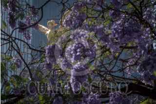CIUDAD DE MÉXICO, 13MARZO2021.- Árbol de jacaranda junto al Ángel de la Independencia en avenida Paseo de la Reforma. FOTO: MARIO JASSO/CUARTOSCURO.COM