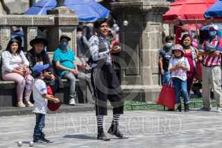 CIUDAD DE MÉXICO, 14MARZO2021.- Un joven caracterizado de payaso se gana la vida haciendo unos malabares en la Alameda Central. FOTO: MOISÉS PABLO/CUARTOSCURO.COM