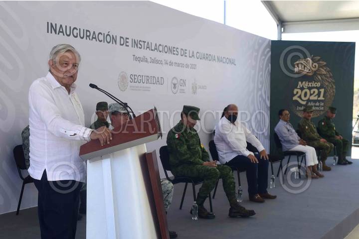 TEQUILA, JALISCO, 14MARZO2021.- Andrés Manuel López Obrador, Presidente de México encabezó la Inauguración de instalaciones de la Guardia Nacional. Lo acompañaron: Enrique Alfaro Ramírez, gobernador del Estado de Jalisco; Rosa Icela Rodríguez Velázquez, Secretaria de Seguridad y Protección Ciudadana; Luis Cresencio Sandoval González, Secretario de la Defensa Nacional; Eduardo Redondo Arámburo, Subsecretario de Marina; Luis Rodríguez Bucio, Comandante de la Guardia Nacional; Arturo Trinidad González, Comandante de la V R.M. y Beatriz Miramontes Rivera, Presidenta Municipal de Tequila, Jalisco. FOTO: PRESIDENCIA/CUARTOSCURO.COM