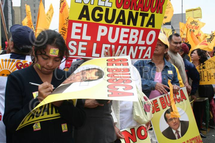 MÈXICO, D.F. 30JULIO2006.-Decenas de miles de ciudadanos simpatizantes de Andrés Manuel López Obrador y con la consigna de que se cuenten toda las casillas y voto por voto de las pasadas elecciones, marcharon hacia el Zócalo por diversas calles de la capital, principalmente por el Paseo de la Reforma. Los asistentes transportaron una representaciòn gigante del listòn tricolor caracterìstico. FOTO: PAOLA HIDALGO/CUARTOSCURO.COM
