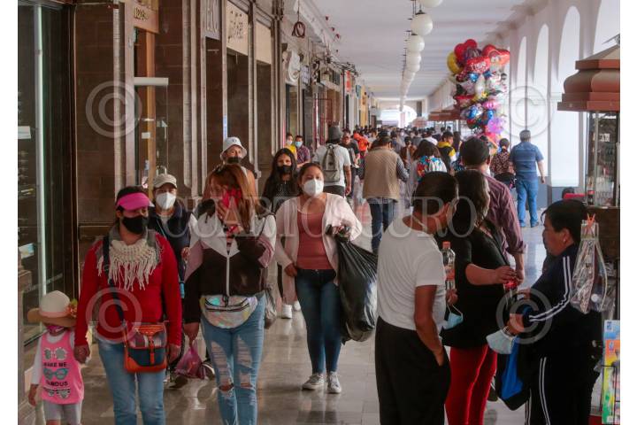 TOLUCA, ESTADO DE MÉXICO, 14MARZO2021.- Fin de semana largo y gente aprovechó para salir a realizar compras o pasear en los Portales de Toluca, el Estado de México continúa en semáforo naranja durante la contingencia por COVID-19 y a partir de este lunes 15 de marzo pequeños negocios, centros comerciales, tiendas departamentales , cines y espacios culturales ampliarán su aforo al 40 por ciento y las instituciones de educación superior y media superior podrán retomar algunas actividades. FOTO: CRISANTA ESPINOSA AGUILAR /CUARTOSCURO.COM