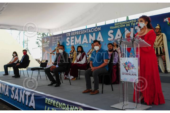 CIUDAD DE MÉXICO, 15MARZO2021.- Por segundo año consecutivo la 178 Representación de la Semana Santa en Iztapalapa será a puerta cerrada, esto debido a la pandemia de Covid-19 que mantiene a la capital del país en semáforo naranja epidemiológico. Para llevar a cabo este evento, los canales públicos de televisión prestarán su señal para que las personas puedan sintonizarlo desde casa. Habrá reducción en los paisajes bíblicos, los cuales contarán con no más de 40 personas por escena. El evento contó con la presencia de Clara Brugada, alcaldesa de Iztapalapa y con Jesús Ramírez, director de Comunicación Social de la Presidencia. FOTO: DANIEL AUGUSTO /CUARTOSCURO.COM