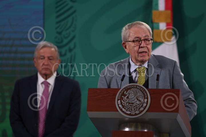 CIUDAD DE MÉXICO, 16MARZO2021.- Andrés Manuel López Obrador, presidente de México, encabezó la conferencia matutina en compañía de Marcelo Ebrard, secretario de Relaciones Exteriores; Jorge Alcocer, secretario de Salud; Hugo López-Gatell, subsecretario de Prevención y Promoción de la Salud, y Luis Cresencio Sandoval, secretario de la Defensa Nacional, presentaron el informe sobre “El Pulso de la Salud”, iniciativa que semanalmente informe el status de la pandemia en nuestros país. Entre los temas destacó el avance en la vacunación a sectores prioritarios, así como las negociaciones previstas para la obtención de nuevas dosis de las farmacéuticas. FOTO: GALO CAÑAS/CUARTOSCURO.COM