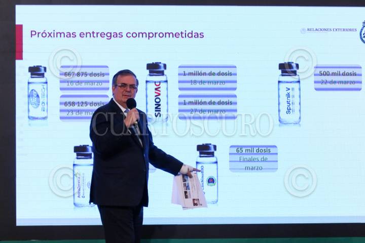 CIUDAD DE MÉXICO, 16MARZO2021.- Andrés Manuel López Obrador, presidente de México, encabezó la conferencia matutina en compañía de Marcelo Ebrard, secretario de Relaciones Exteriores; Jorge Alcocer, secretario de Salud; Hugo López-Gatell, subsecretario de Prevención y Promoción de la Salud, y Luis Cresencio Sandoval, secretario de la Defensa Nacional, presentaron el informe sobre “El Pulso de la Salud”, iniciativa que semanalmente informe el status de la pandemia en nuestros país. Entre los temas destacó el avance en la vacunación a sectores prioritarios, así como las negociaciones previstas para la obtención de nuevas dosis de las farmacéuticas. FOTO: GALO CAÑAS/CUARTOSCURO.COM