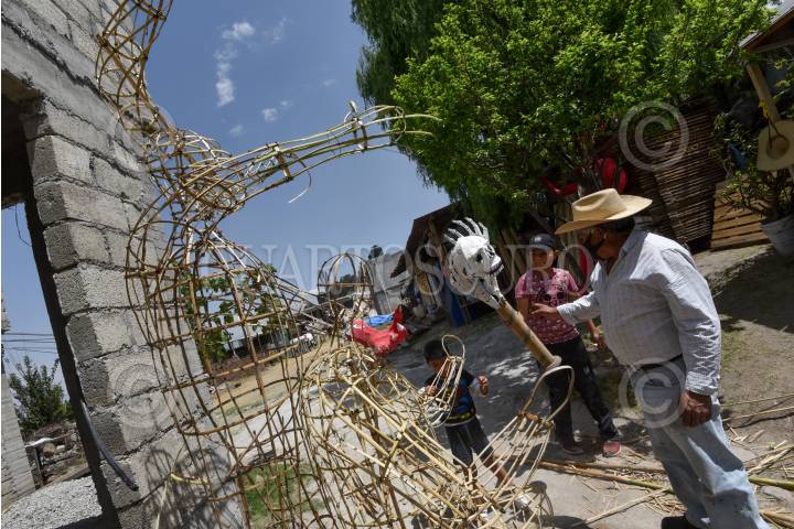ALMOLOYA DE JUÁREZ, ESTADO DE MÉXICO, 17MARZO2021.- Marcelino Medina Galván, originario de San Mateo Tlachichilpan en Almoloya de Juárez, quien se dedica al campo y a la pirotecnia se encuentra preparando su pieza para poder participar en el concurso de Judas que se realizará el 24 de marzo; una de las actividades que marca la Semana Santa en el Valle de Toluca es el tradicional concurso de Judas, el paseo y posteriormente su quema, a raíz de la pandemia por COVID-19 sufrió modificaciones, no se realiza exposición en el Museo Luis Nishizawa y la quema en la Plaza de los Mártires el Sábado de Gloria. Carrizo, hilo, engrudo, papel, pintura son los materiales que utiliza para elaborar los Judas, él y su familia han participado año con año en este concurso desde que inició hace 28 años, siendo ya cuatro generaciones que se involucran en el trabajo de cada pieza, plasmando los males que aqueja a la humanidad. FOTO: CRISANTA ESPINOSA AGUILAR /CUARTOSCURO.COM