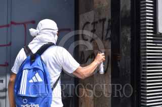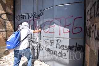 CHILPANCINGO, GUERRERO, 17MARZO2021.- Profesores de la Coordinadora Estatal de Trabajadores de la Educación en Guerrero (CETEG), de las regiones Acapulco, Costa Grande y Norte, protestaron en la Subsecretaría de Planeación Educativa y en la Dirección de Personal de la SEG, donde realizaron pintas, para exigir la entrega de 80 nombramientos. A las 12 del mediodía, poco más de 250 profesores llegaron a las oficinas de la subsecretaría de planeación, a pocos metros del hospital de la madre y el niño guerrerense y tomaron las instalaciones. Minutos más tarde, un grupo de profesores se trasladó a la Dirección de Personal, en la colonia Universal y realizaron pintas y cerraron con cadena la entrada principal, exigiendo la salida inmediata de Nybia Solís Peralta, titular de esa dependencia. Los docentes golpearon con piedras el portón del inmueble, y con una varilla trataron de romper la cerradura, también balancearon la puerta hasta casi desprenderla, pero ésta resistió la embestida y los maestros no pudieron ingresar al interior de la oficina. FOTO: DASSAEV TÉLLEZ ADAME/CUARTOSCURO.COM