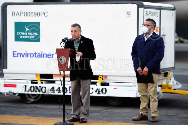 CIUDAD DE MÉXICO, 18MARZO2020.-Recepción de un millón de vacunas Sinovac, en el Aeropuerto Internacional de la Ciudad de México, procedente de Hong Kong. FOTO:PRESIDENCIA / CUARTOSCURO.COM