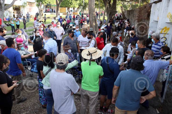 JIUTEPEC, MORELOS, 18MARZO2021.-Miles de personas de la tercera edad acompañadas de sus familiares formaron una larga fila alrededor de la secundaria número 3 "Eulalia Guzmán", ubicada en este municipio para que se les aplique la vacuna contra el Covid 19. Son 12 los centros de vacunación que se habilitaron en este municipio. La aplicación tardó en comenzar en medio de un desorden, pues los funcionarios federales no aceptaron la ayuda del municipio. FOTO: MARGARITO PÉREZ RETANA /CUARTOSCURO.COM