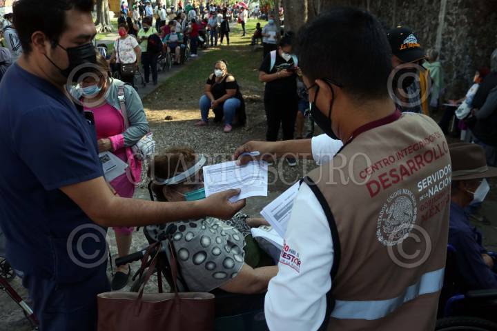 JIUTEPEC, MORELOS, 18MARZO2021.-Miles de personas de la tercera edad acompañadas de sus familiares formaron una larga fila alrededor de la secundaria número 3 "Eulalia Guzmán", ubicada en este municipio para que se les aplique la vacuna contra el Covid 19. Son 12 los centros de vacunación que se habilitaron en este municipio. La aplicación tardó en comenzar en medio de un desorden, pues los funcionarios federales no aceptaron la ayuda del municipio. FOTO: MARGARITO PÉREZ RETANA /CUARTOSCURO.COM