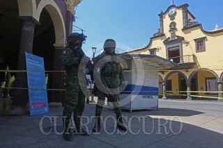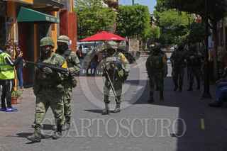 TLAQUEPAQUE, JALISCO, 18MARZO2021.- Horas después de que circulara en redes sociales un video donde aparecía un hombre que se dijo ser, Carlos Enrique Sánchez Martínez, alias El Cholo, un cuerpo envuelto en plástico negro y con dos mensajes clavados con cuchillos, haciendo alusión a su nombre, fue dejado en una de las bancas del Centro de San Pedro Tlaquepaque. El hecho se registro en el Jardín Hidalgo ubicado sobre las inmediaciones de la calle Francisco I Madreo al cruce con Morelos en pleno centro de San Pedro y a una cuadra de la Presidencia Municipal, lo que desato una gran movilización de diversas dependencias de seguridad así como personal del Instituto Jalisciense de Ciencias Forenses (IJCF), para realizar el levantamiento del cuerpo. FOTO: FERNANDO CARRANZA GARCIA / CUARTOSCURO.COM