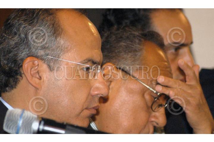 MÉXICO D.F. 01AGOSTO2006.- Rafael Zaga Kalach, presidente de la camara de la industria textil y Felipe Calderón candidato del PAN a la presidencia de la república, durante la reunión que sostubieron con integrantes de la misma. FOTO: Guillermo Perea/CUARTOSCURO.COM