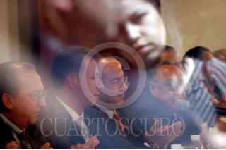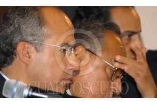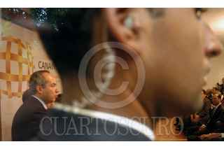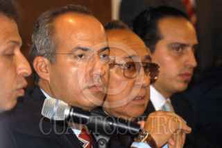 MÉXICO D.F. 01AGOSTO2006.- Rafael Zaga Kalach, presidente de la camara de la industria textil y Felipe Calderón candidato del PAN a la presidencia de la república, durante la reunión que sostubieron con integrantes de la misma. FOTO: Guillermo Perea/CUARTOSCURO.COM