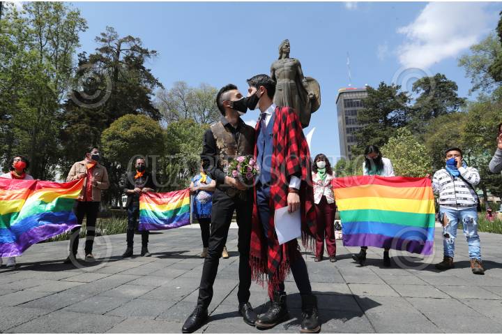 TOLUCA, ESTADO SE MÉXICO, 21MARZO2021.- La pareja confirmada por Daniel Contreras y Jesús Duarte, ganaron un amparo a través de la asociación civil Fuera del Clóset A. C., y contrajeron matrimonio por el civil, acompañados por algunos amigos u familiares exigieron a los integrantes de la LX Legislatura del Estado de México el reconocimiento del matrimonio igualitario en la entidad. FOTO: CRISANTA ESPINOSA AGUILAR /CUARTOSCURO.COM