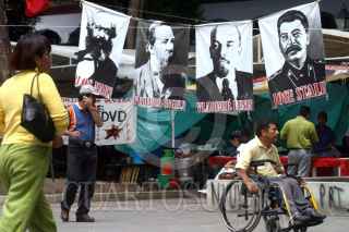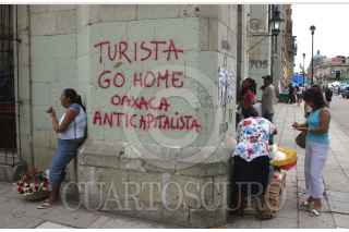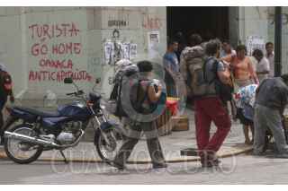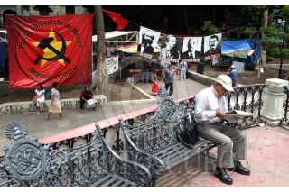 OAXACA, OAXACA 01AGOSTO2006.- Aspecto de la plaza de armas de esta ciudad, la cual se halla invadida por innumerables pancartas con mensajes y personajes politicos, lo cual forma parte de las protestas de profesores e integrantes de la Asamblea Popular del Pueblo de Oaxaca, que desde el pasado primero de mayo, exigen la renuncia del gobernador local, Ulises Ruiz. FOTO: JGuadalupe Perez/CUARTOSCURO.COM