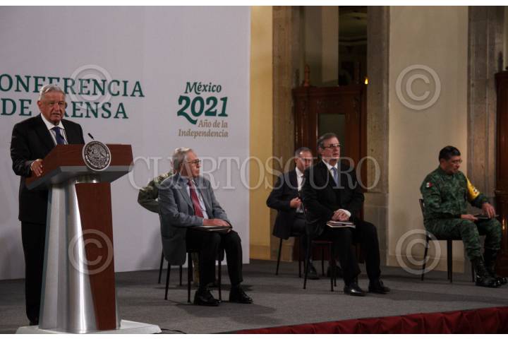 CIUDAD DE MÉXICO, 23MARZO2021.- Andrés Manuel López Obrador, presidente de México acompañado de Jorge Alcocer Varela, secretario de Salud; Marcelo Ebrard Casaubon, secretario de Relaciones Exteriores; Luis Cresencio Sandoval Gónzalez, secretario de la Defensa Nacional; Eduardo Redondo Arámbulo, subsecretario de Marina y Hugo López-Gatell Ramírez, subsecretario de Prevención y Promoción de la Salud, durante la conferencia dedicada al tema de Salud; destacando el avance de la vacunación contra COVID-19 en México. La conferencia se llevó a cabo en Palacio Nacional. FOTO: ANDREA MURCIA /CUARTOSCURO.COM
