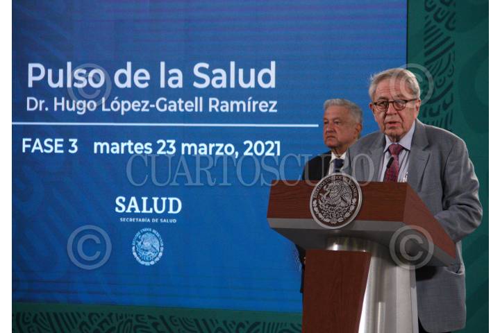 CIUDAD DE MÉXICO, 23MARZO2021.- Andrés Manuel López Obrador, presidente de México acompañado de Jorge Alcocer Varela, secretario de Salud; Marcelo Ebrard Casaubon, secretario de Relaciones Exteriores; Luis Cresencio Sandoval Gónzalez, secretario de la Defensa Nacional; Eduardo Redondo Arámbulo, subsecretario de Marina y Hugo López-Gatell Ramírez, subsecretario de Prevención y Promoción de la Salud, durante la conferencia dedicada al tema de Salud; destacando el avance de la vacunación contra COVID-19 en México. La conferencia se llevó a cabo en Palacio Nacional. FOTO: ANDREA MURCIA /CUARTOSCURO.COM